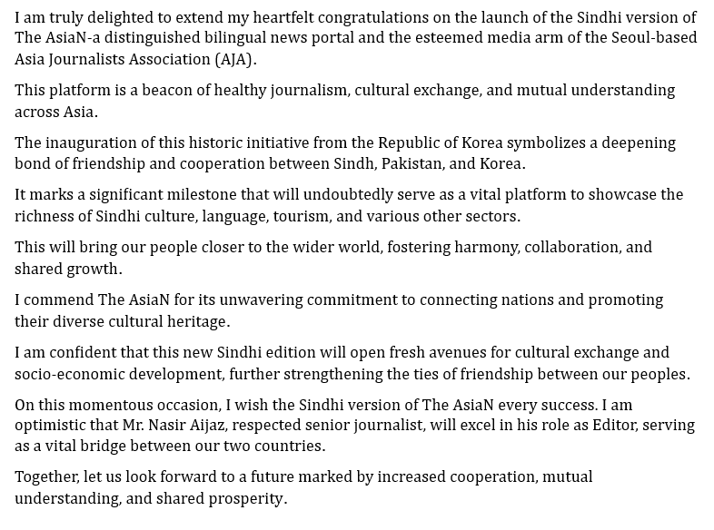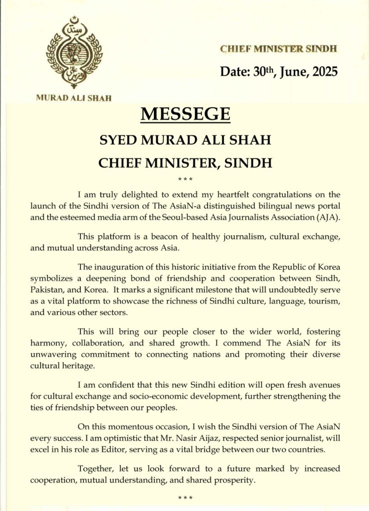 Congratulatory message by Chief Minister Sindh, Syed Murad Ali Shahon the Launch of the Sindhi Version of The AsiaN