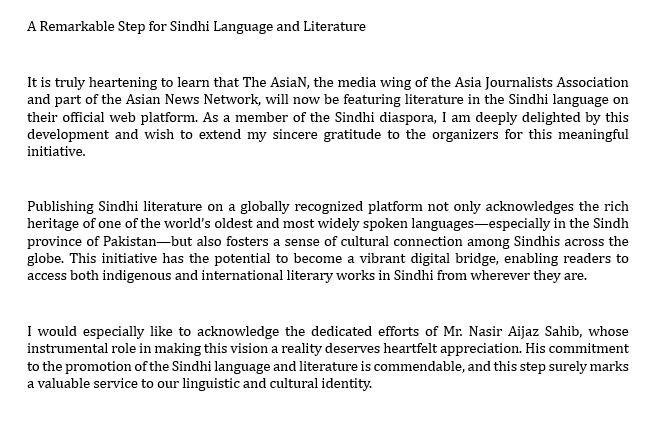 اهو هڪ انتهائي خوشي جو لمحو آهي ته دي ايشيا اين، جيڪا ايشيا جرنلسٽس ايسوسيئيشن جي ميڊيا وِنگ آهي ۽ ايشيائي نيوز نيٽورڪ جو حصو پڻ، اها هاڻي پنهنجي ويب پيج تي سنڌي ٻولي ۾ ادب شايع ڪرڻ شروع ڪري رهي آهي. هڪ سنڌي پرڏيهي طور تي، مان هن خوشخبري تي تمام گهڻو خوش آهيان ۽ انهن سڀني منتظمين جو ٿورائتو پڻ آهيان، جن اهم قدم کنيو آهي ۽ دنيا جي قديم ترين ۽ گهڻي ڳالهائيندڙ ٻولين مان هڪ سنڌي ٻولي کي اهميت ڏئي رهيا آهن، جيڪا دنيا جي مختلف ملڪن سان گڏوگڏ خاص طور تي پاڪستان جي صوبي سنڌ ۾ ڳالهائي وڃي ٿي.