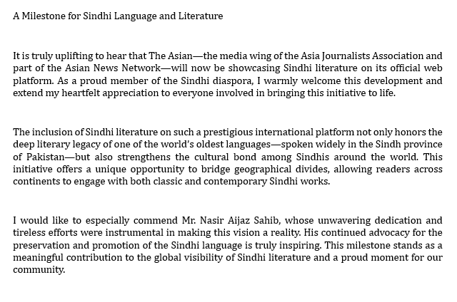 Congratulatory message by Mr. Mahesh Kumar, Editor of a Sindhi language Daily Sindh the Launch of the Sindhi Version of The AsiaN