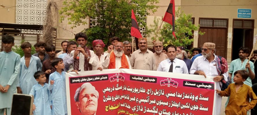 سردارن جي سرپرستي ۾ ڌاڙيل راڄ، جرڳن وسيلي عورتن جي قتلام، ڪارپوريٽ فارمنگ، ڊيم ۽ ڪئنال ٺاهي سنڌ جو پاڻي بند ڪرڻ ۽ وسيلن جي ڦرلٽ خلاف عوامي تحريڪ طرفان لاڙڪاڻي ۾ بک هڙتال.