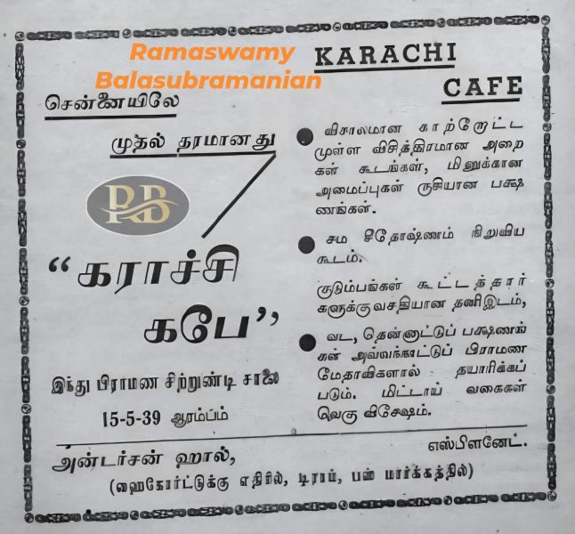 ڊاڪٽر رَوي ڪمار لکي ٿو تہ اخباري اشتھار 15 مئي 1939 جو ڇپيل آھي جنھن ۾ ”ڪراچي ڪيفي“ کُلڻ جو اعلان ڪيو ويو آھي. اھو ڪافي ھائوس خاص ھندو برھمڻن لاءِ ھو ۽ مدراس ھاءِ ڪورٽ جي بلڪل سامھون اينڊرسن ھال جي ويجھو ئي ھيو.