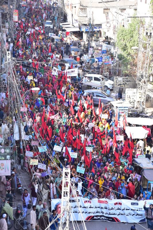 27 هين آئيني ترميم، ڪارپوريٽ فارمنگ، ڪئنالن، معدني وسيلن تي ڌاڙن، سنڌ کي ٽڪرا ڪرڻ جي سازش، قبيلائي دهشتگردي، ڪارو ڪاري ۽ عورتن جي قتلن خلاف آچر سورھين نومبر تي سٽي گيٽ کان حيدرآباد پريس ڪلب تائين هزارين سنڌياڻين مارچ ڪيو.
