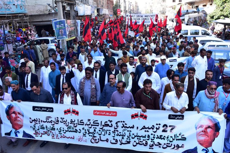سنڌياڻي تحريڪ جي مرڪزي صدر عمره سمون چيو ته سنڌ جون زمينون ۽ وسيلا وڪڻڻ لاءِ ايس آئي ايف سي جو ادارو به پيپلز پارٽي جي سهڪار سان ٺاهيو ويو آهي. عدالتون جيڪي 26هين آئيني ترميم سبب اڳ ۾ ئي مفلوج آهن تن کي مڪمل طور حڪومتي درٻار بڻائڻ لاءِ 27هين ترميم آندي وئي آهي. هن وڌيڪ چيو ته سنڌي عوام وٽ هاڻي پر امن جدوجهد کانسواءِ ڪو به رستو نه بچيو آهي. عوام جي هر طبقي جو عوامي جدوجهد جي ميدان ۾ اچڻ گهرجي. هن وڌيڪ چيو ته سنڌ ۾ پيپلزپارٽي سرڪار جو بدترين فاشسٽ راڄ قائم آهي، بورڊ آف انويسٽمينٽ اميڊمينٽ ايڪٽ 2023ع ۽ 27هين ترميم ملڪ جي وجود تي وار آهي، سنڌ ۾ جاگيرداري نظام کي مضبوط ڪري عورتن جو قتلام ڪيو پيو وڃي، ڪارو ڪاري جو ڪاروبار حڪومتي سرپرستي ۾ جاري آهي.