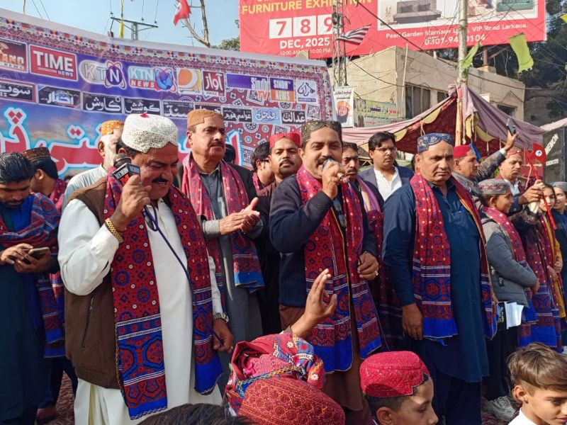سنڌي ثقافتي ڏھاڙو: لاڙڪاڻو شھر اجرڪ ۽ ٽوپين جي انڊلٺي رنگن سان جرڪي پيو