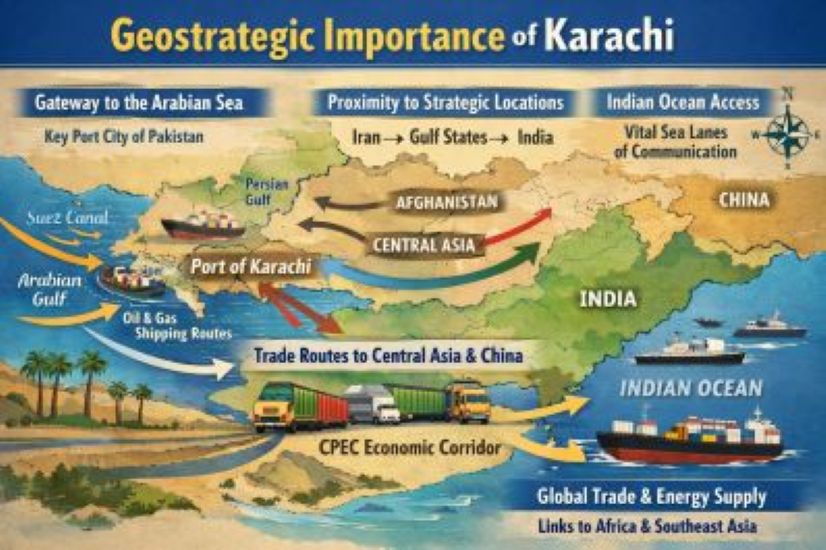 ڪراچي پاڪستان جي معيشت جو اهم مرڪز آهي ۽ هڪ اندازي مطاق پاڪستان جو ٩٥ سيڪڙو تجارت ڪراچي بندر جي ذريعي ٿيندي آهي ، جنھن لاءِ چارلس نيپيئر چيو هئو ته ڪراچي توکي اڃان اوڀر جي اڳواڻي ڪرڻي آهي۔ ڪراچي شهر پاڪستان جي جيو اسٽريٽيجيڪ ۽ جيو پوليٽيڪل لحاظ کان هندي يا عربي سمنڊ جي اهم بندرگاہ جي حيثيت رکي ٿو جنهن جي ذريعي يورپ، وچ اوڀر، سينٽرل اشيا ۽ آفريڪا جي تجارت ڪرڻ ۾ اهم ڪردار ادا ڪري ٿو۔ چين ۽ پاڪستان جي سيپيڪ ۽ چائنا بي آر آئي منصوبي جي لاء به ڪراچي جي تمام گهڻي اهميت رکي ٿو۔