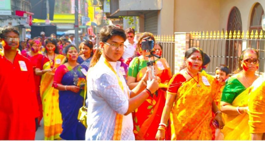 صبح جو جلوس مندرن تان شروع ٿيا، جن ۾ بهار جا مٺڙا گيت، روايتي ناچ ۽ ’ڍاڪ‘ (روايتي دهل) جا آواز شامل هئا. ’ابير‘ (چمڪندڙ رنگين پاؤڊر) جي بادلن فضا کي ڀري ڇڏيو، جنهن هڪ اهڙو شاندار منظر پيدا ڪيو جو مقامي رهواسي حيران رهجي ويا.