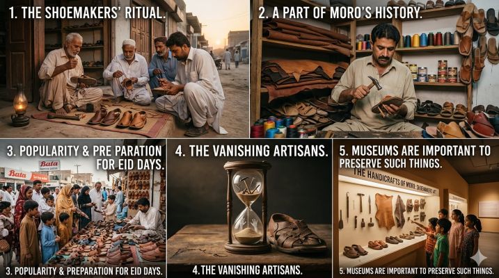 عيد جا ڏينهن هن سونهري دور جو عروج هوندا هئا. اهي ڏينهن ويجهو اچڻ سان بازار ۾ رونق وڌي ويندي هئي. ماڻهو پنهنجي لاءِ نوان بوٽ ۽ سينڊل خريد ڪرڻ لاءِ ايندا هئا. ڊيزائن چونڊڻ، اگهه ڪرڻ ۽ پنهنجي سامهون اهي سڀ ٺهندي ڏسڻ، اهو سڀ هڪ خوشگوار تجربو هوندو هو. اها رڳو خريداري نه پر هڪ روايت ۽ جذباتي لاڳاپو هو. جيتوڻيڪ ان وقت Bata ۽ Service جا دڪان به موجود هئا، پر مقامي ڪاريگرن کان بوٽ ۽ سينڊل خريد ڪرڻ ۾ هڪ الڳ مزو هوندو هو. اهي جتيون عام نه پر خاص هونديون هيون جيڪي هر ماڻهوءَ جي پسند مطابق ٺهنديون هيون. پر افسوس ته اهي سونهري هٿن وارا ڪاريگر ماڻهو جن موري جي معيشت کي سڃاڻپ ڏني هئي، سي وقت جي اونداهيءَ ۾ گم ٿي ويا آهن ۽ وقت سان گڏ سڀ ڪجهه بدلجي ويو.