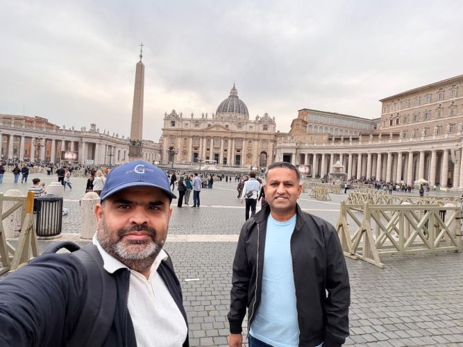 سينٽ پيٽرز اسڪوائر جي چوڌاري تمام گهڻي رونق هئي. دنيا جي مختلف ملڪن مان آيل سياح ۽ زيارت ڪندڙ وڏي ميدان ۾ گهمي رهيا هئا، شاندار عمارتن کي ڏسي رهيا هئا ۽ تصويرون وٺي رهيا هئا. اسان به جام تصويرون ڪڍيون.