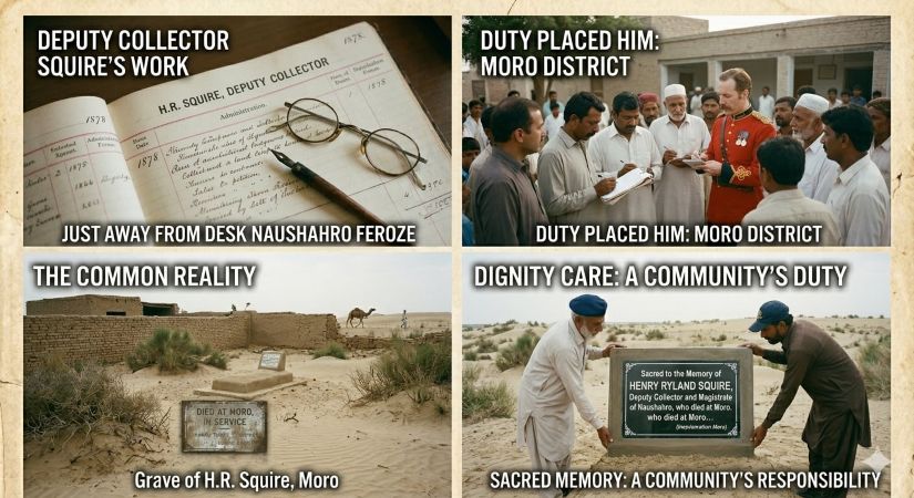 وقت جي دز هيٺان دٻيل ماضي برطانوي دور ۾ نوشھري فيروز جي ڊپٽي ڪليڪٽر هينري رائيلينڊ اسڪوائر جي قبر آھي جيڪا اسان جي بي حسيءَ جي ڪھاڻي ٻُڌائي ٿي. چوڌاري والار ۽ گندگيءَ جي ڍير ۾ زبون حال قبر سلطنتن جي عروج کان موري جي مٽيءَ تائين انڊين سِول سروس جي ھڪ انگريز آفيسر جي سفر جي خاموش شاھد آھي.